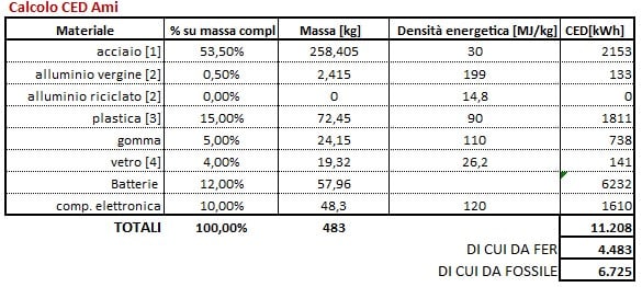Certo è che l’energia incorporata in un veicolo elettrico è più grande di quella di un veicolo a motore a scoppio (vedi il post menzionato sopra). Teniamo quindi conto di questo aspetto e consideriamo l’intero ciclo di vita dei due veicoli, diciamo di 200.000 km: considerando l’energia incorporata (CED) nei due veicoli e la manutenzione annua il costo energetico complessivo della AMI risulta nell’arco della sua “esistenza” pari a 61 MWh (di cui 40 MWh da combustibili fossili), contro 167 MWh della Golf (di cui 144 da combustibili fossili). Circa 3 volte tanto.