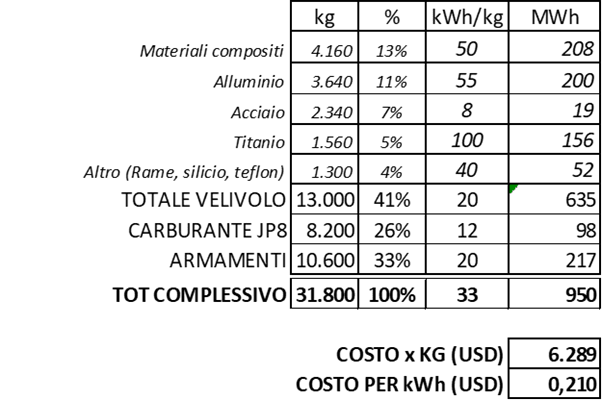 L’energia incorporata del velivolo è di 635 MWh, a cui occorre aggiungere 98 MWh del carburante e 217 MWh degli armamenti (questi ultimi qui sommariamente quantificati utilizzando lo stesso valore medio per chilogrammo dell’aereo, cioè 20 kWh/kg, che comunque non è moltissimo: il prosciutto crudo ne fa 55).