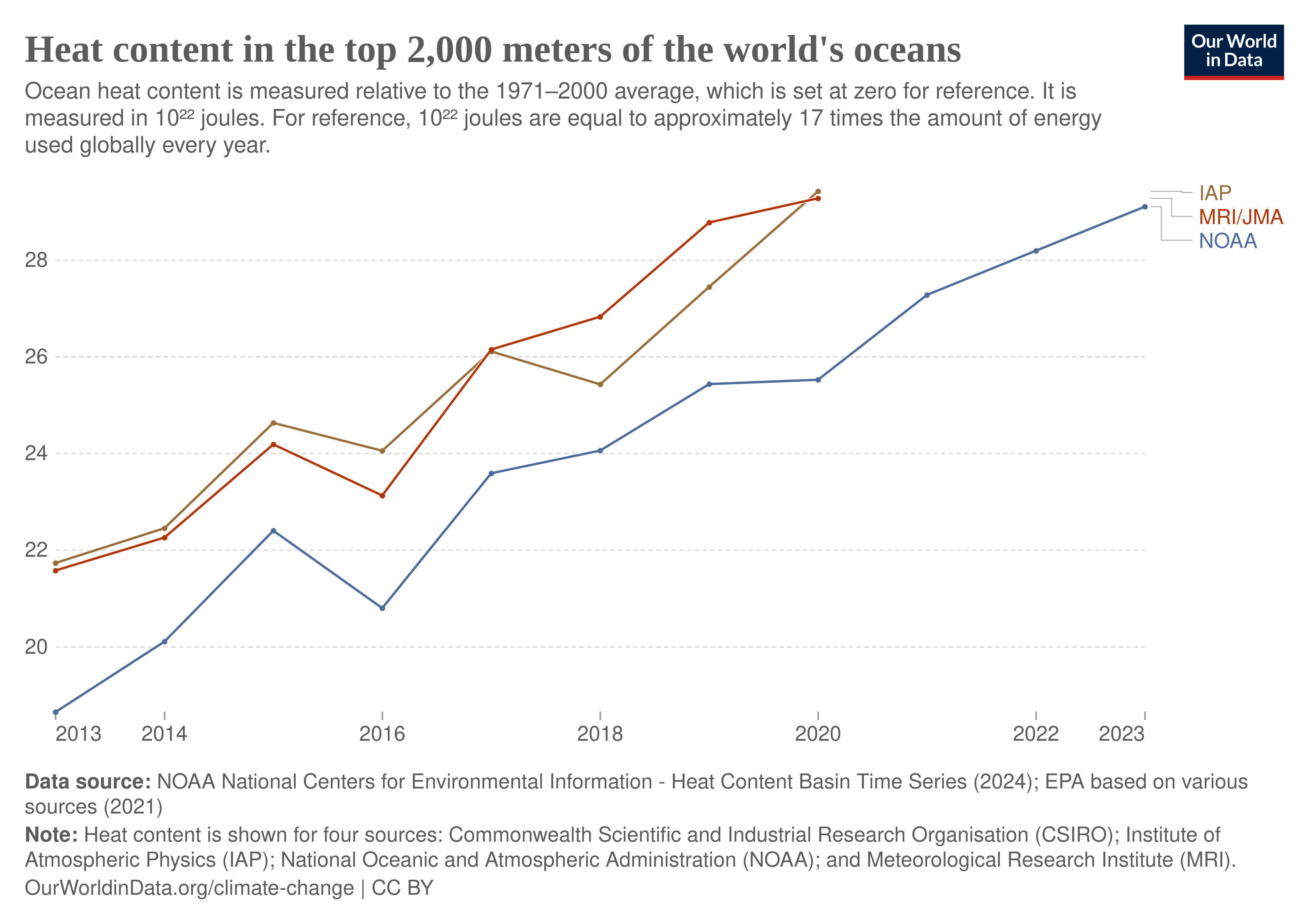Ma quanto calore stanno in effetti assorbendo gli oceani e come è variato il tasso di assorbimento negli ultimi anni? Come possiamo immaginare, anche qui le notizie non sono buone: sempre il NOAA, riportato nel grafico sotto da Our World in Data, ci dice che nel decennio 2013-2023 il calore contenuto nei primi 2000 metri di profondità degli oceani è aumentato del 56%. Di quanto calore stiamo parlando, in termini assoluti? L’aumento nel decennio è pari a \(10.46 \; 10^{22} \textrm{J}\), o se preferite 105 zettajoule. In termini dei nostri amati wattora, diventa \(2.9\; 10^{19} \textrm{Wh}\).
