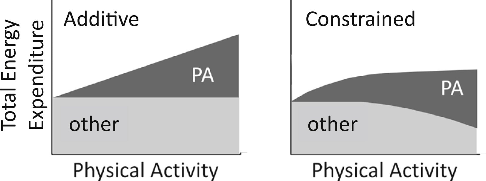 Da questo ulteriore risultato paradossale è stato proposto un modello, chiamato “Constrained Total Energy Expenditure”: a bassi livelli di attività fisica l’energia consumata cresce linearmente, ma poi flette verso un plateau all’aumentare dell’intensità. Questo perché il corpo sembra adattarsi, modificando il metabolismo: spende infatti meno energia durante le fasi di inattività.