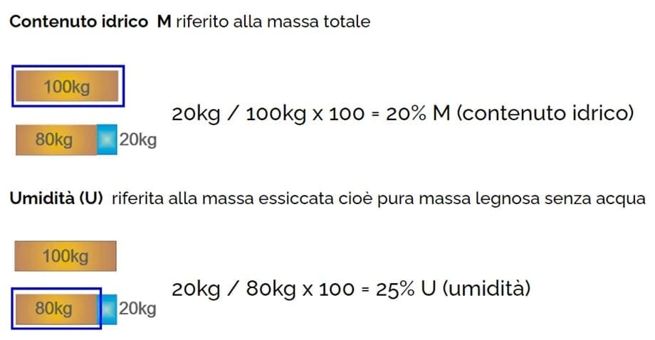 Qui schematicamente spiegato:Anche al momento dell’acquisto, bisogna prestare attenzione al già nominato contenuto idrico (M) in quanto, se compriamo legna a peso, questo determinerà il costo dell’energia che stiamo acquistando.